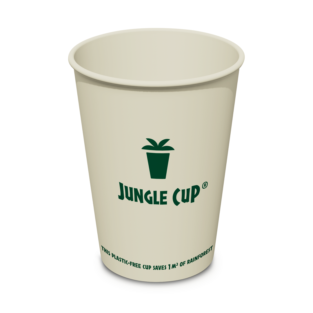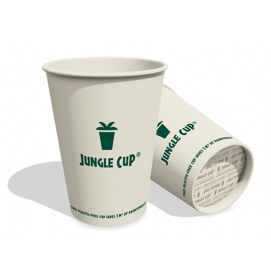 De nieuwe Jungle Cup® vervangt de plastic binnenvoering door een nano layer, waardoor de beker de 'Flustix' gecertificeerde plasticvrije certificering krijgt. Het is ook de enige wegwerpbeker ter wereld die is gemaakt van materialen die zijn gecertificeerd als 'thuis composteerbaar', wat betekent dat hij biologisch afbreekbaar is in een natuurlijke omgeving, zoals een composthoop thuis. De Jungle Cup® helpt het kwaad van oceaanplastic te bestrijden.